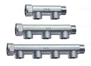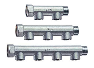 Коллектор 1 1/4" проходной (ВР-НР) 4 отвода (ВР) 1/2" (межосевое 50 мм) FAR