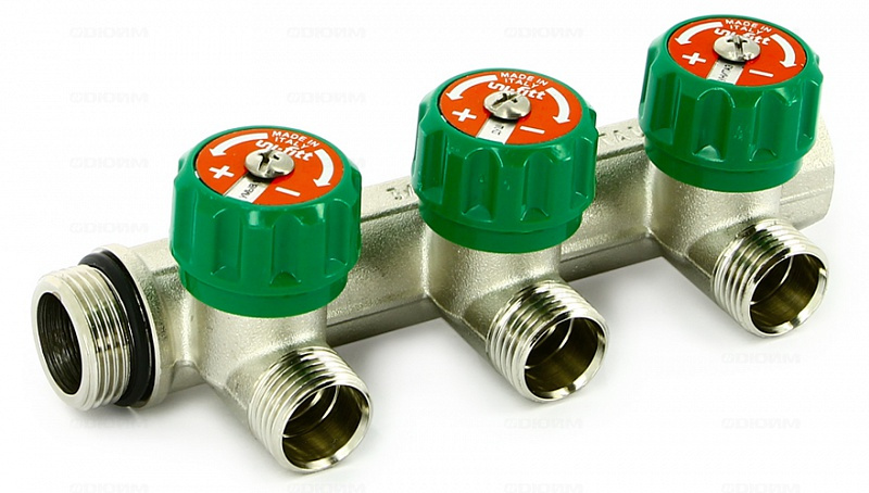 Коллектор НВ 3/4"x3/4"ЕК (с вентилями, 90 гр., м/ц 45мм, хром.) 3 выхода UNI-FITT